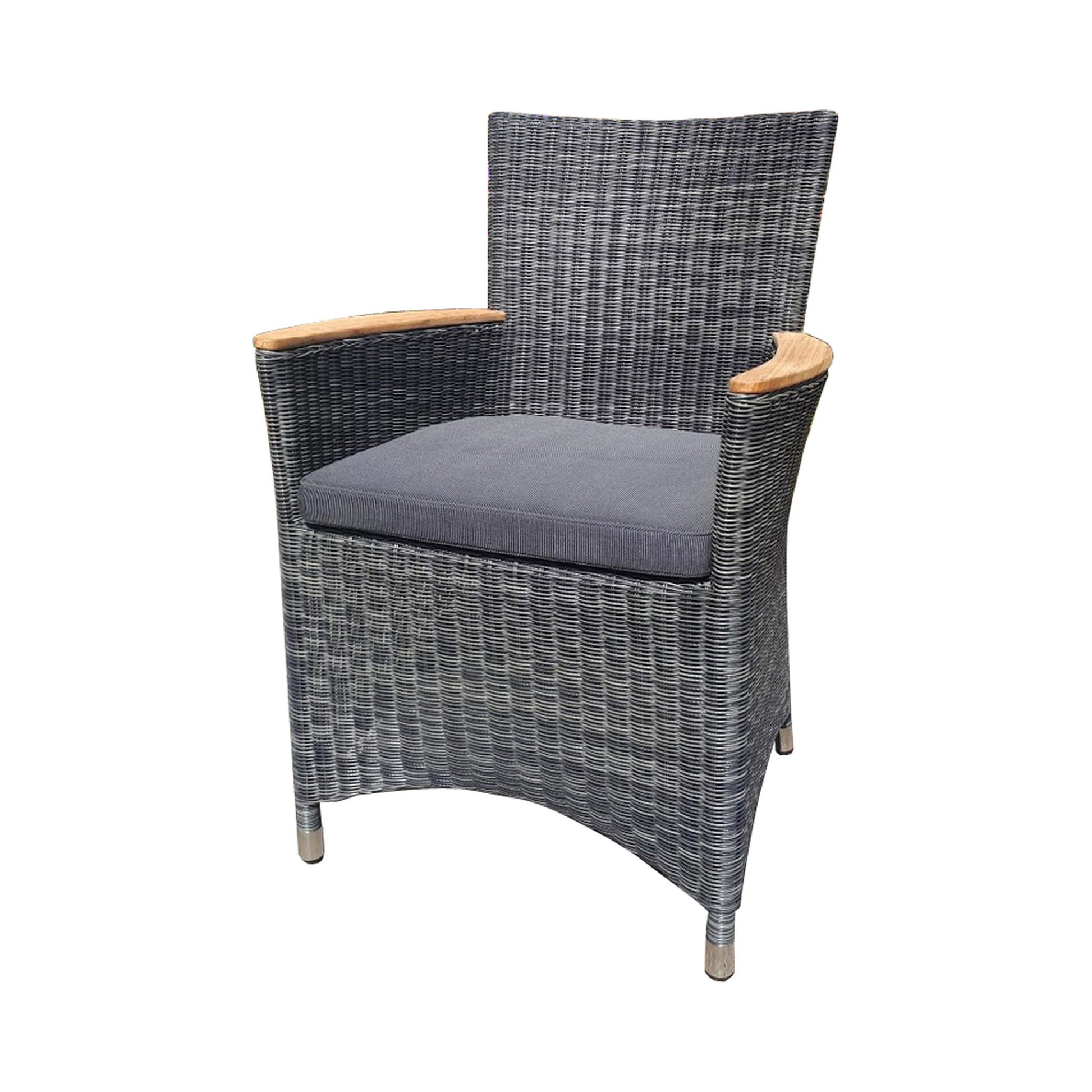 Grå havestol i flet med en lækker detalje: armlæn i teaktræ. Teaktræet giver både stolen et smukt udseende og samtidig sikrer du, at armlænene ikke bliver varme i solen.
