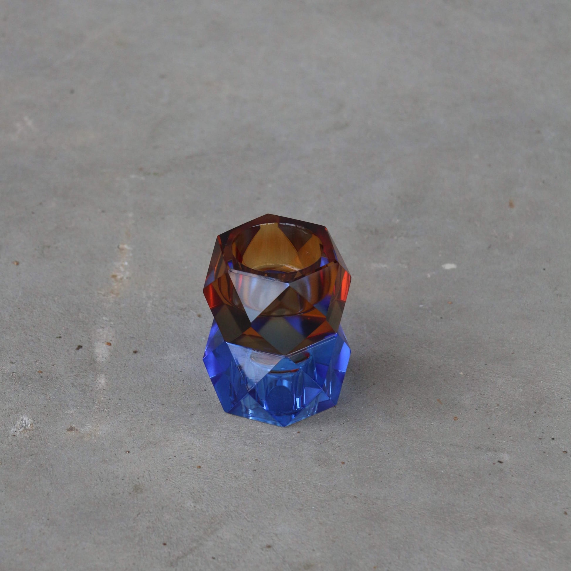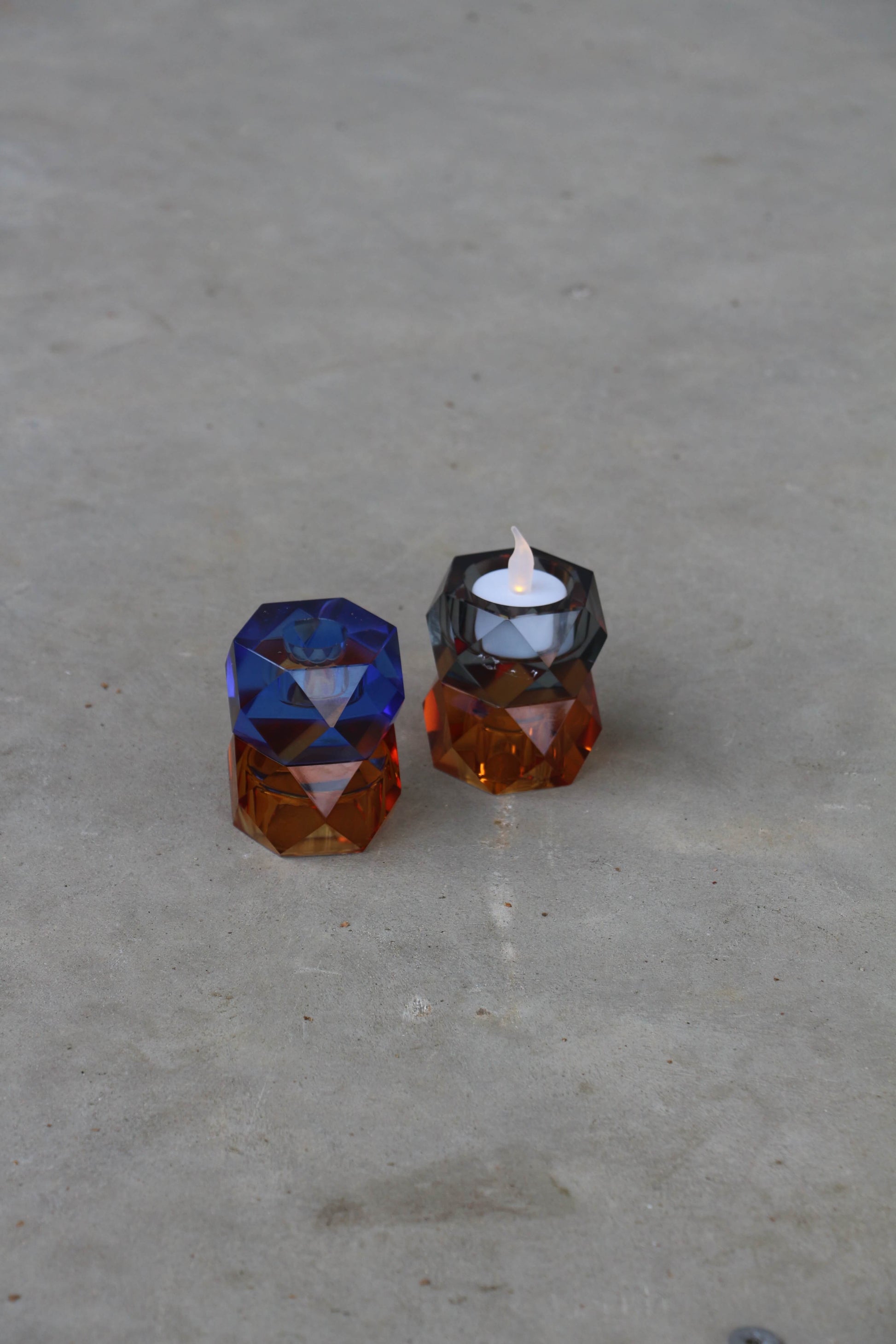 Smuk vendbar krystalstage i brun og blå. Stagen er vendbar, hvilket betyder at du både kan bruge fyrfadslys og stagelys i denne lysestage afhængig af, hvilken vej du vender den.